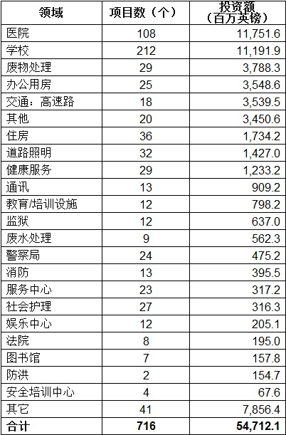 截至2012年3月,在PFI下共有717個(gè)項(xiàng)目,總投資547億英鎊。其中,648個(gè)處于運(yùn)行階段。具體情況見附表。